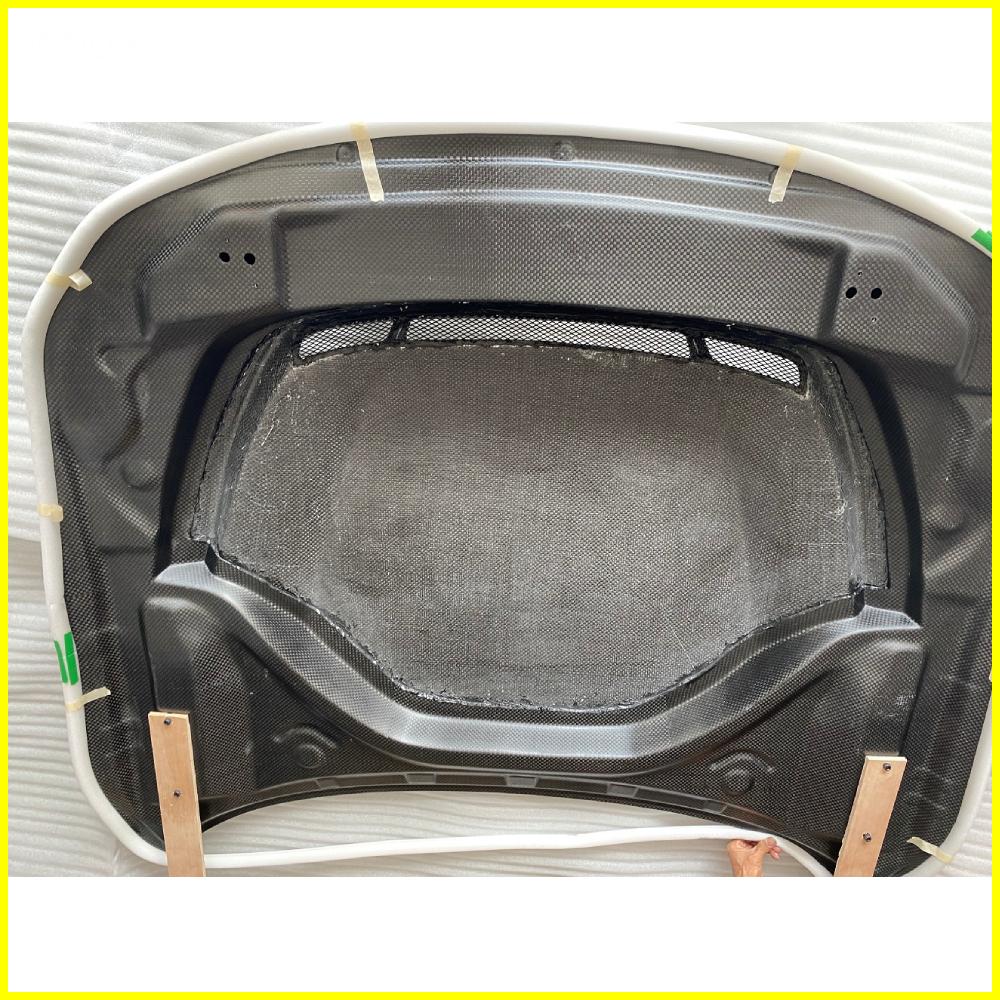ICOOH TUNING The front hood bonnet is crafted from genuine, handmade carbon fiber. Each piece is meticulously produced to the highest standards by master craftsmen, utilizing the finest race-performance materials. Our manufacturing process for aerodynamic parts employs vacuum forming technology to extract excess resin, ensuring a flawless surface with a lightweight distribution that doesn't compromise structural rigidity. This meticulous process allows for precise control over fit and finish, providing you with the assurance that the part will seamlessly match the factory shut lines and contours.